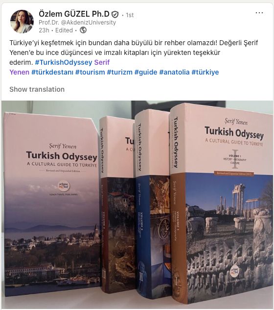 Türkiye’nin öne çıkan ve iz bırakan rehberlerinden Şerif Yenen’in İngilizce kaleme aldığı bu üç ciltlik eser, Anadolu’nun tarihini, arkeolojisini, sanatını ve geleneklerini özgün bir bakışla anlatıyor. Şerif Yenen’in kırk yıla yaklaşan saha deneyimiyle şekillenen Turkish Odyssey, yalnızca bir rehber değil; hem gezginlere hem de kültür meraklılarına Türkiye’yi derinlemesine keşfetme imkânı sunan benzersiz bir kültür yolculuğu.