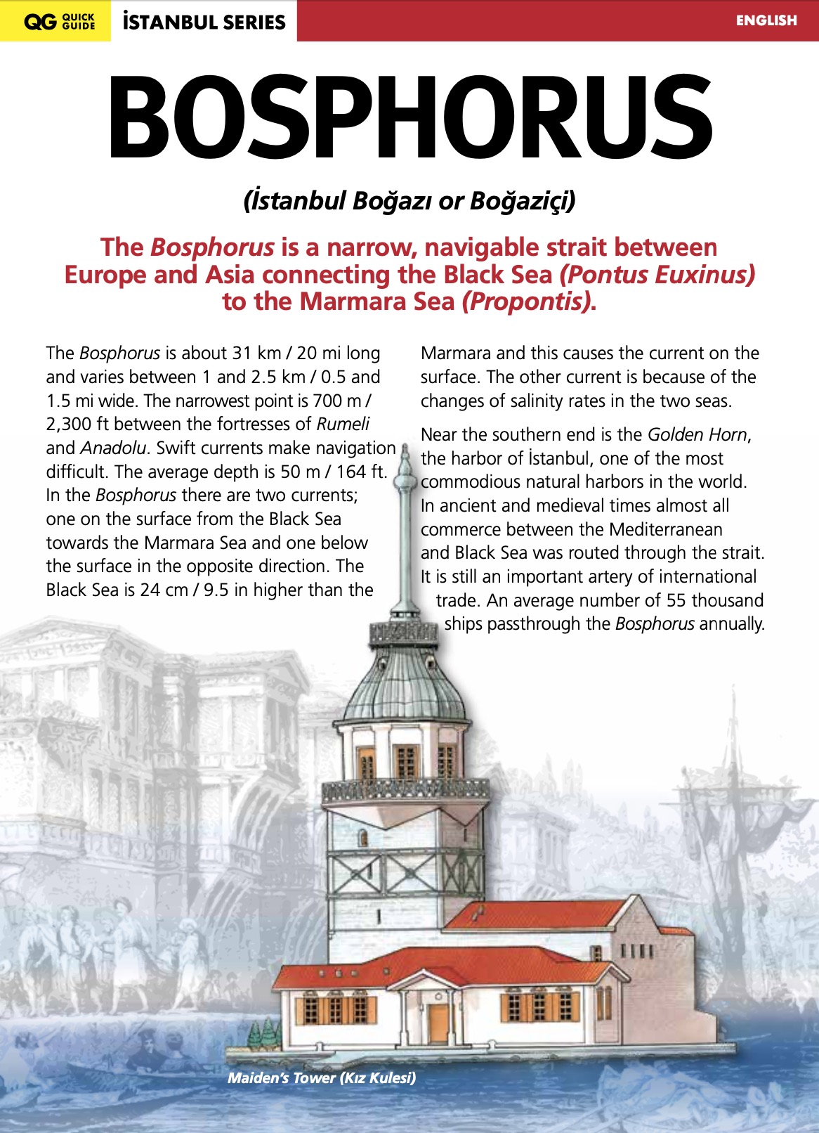 A user friendly and informative brochure with illustrations and plans. Its content is very easy to understand. In addition to general information about the Bosphorus (Bosporus-Bogazici) in Istanbul, Turkey, it shows the photos of all of the major buildings (palaces, yalis, mansions, bridges, castles, etc.) on the Bosphorus. One of the nicest experiences in Istanbul is taking a cruise on the Bosphorus. With this pamphlet, you can easily identify buildings around you.
